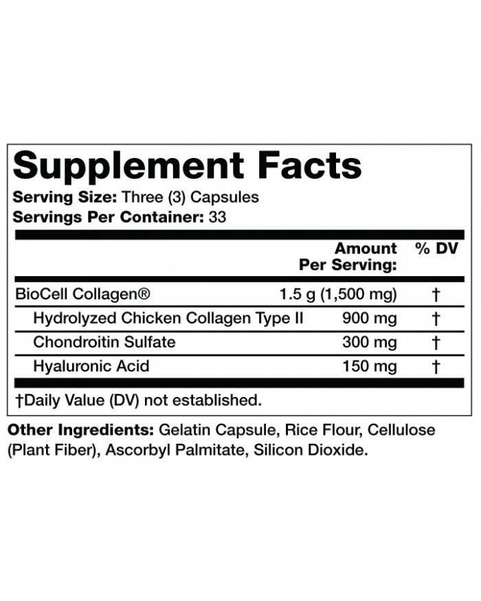 BioCell Collagen contains naturally occurring hydrolyzed collagen type II, chondroitin sulfate, and hyaluronic acid in a bioactive matrix form.