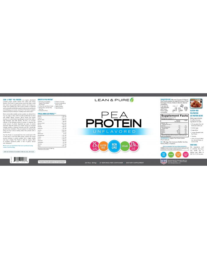 Lean & Pure Pea Protein – Unflavored is an organic, vegetable-based complete protein powder derived from yellow peas (Pisum sativum). Pea Protein is a great protein source that helps to build lean muscle mass, provides optimum nutrition, and keeps your hunger more satisfied than other protein powders. Its balanced amino acid profile with BCAAs is great for intense workouts and challenging your muscles.
